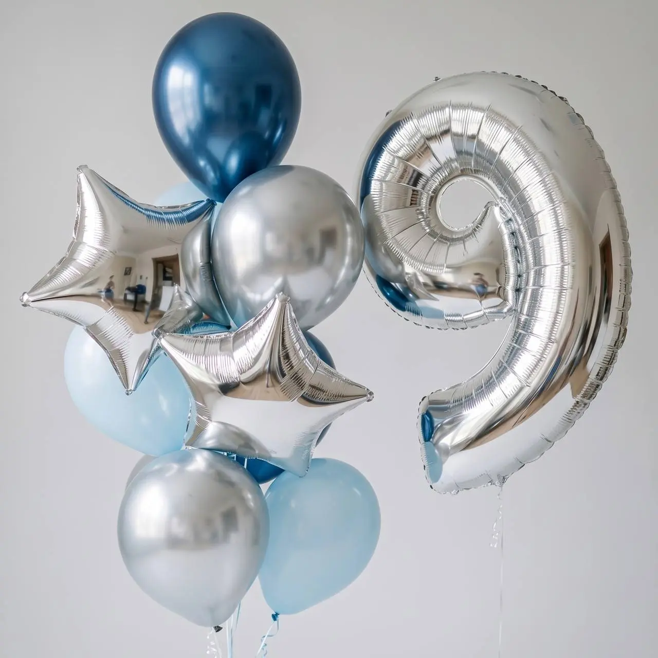 Большая цифра делает акцент на возрасте, а хром и матовые шарики добавляют глубины и объема композиции.