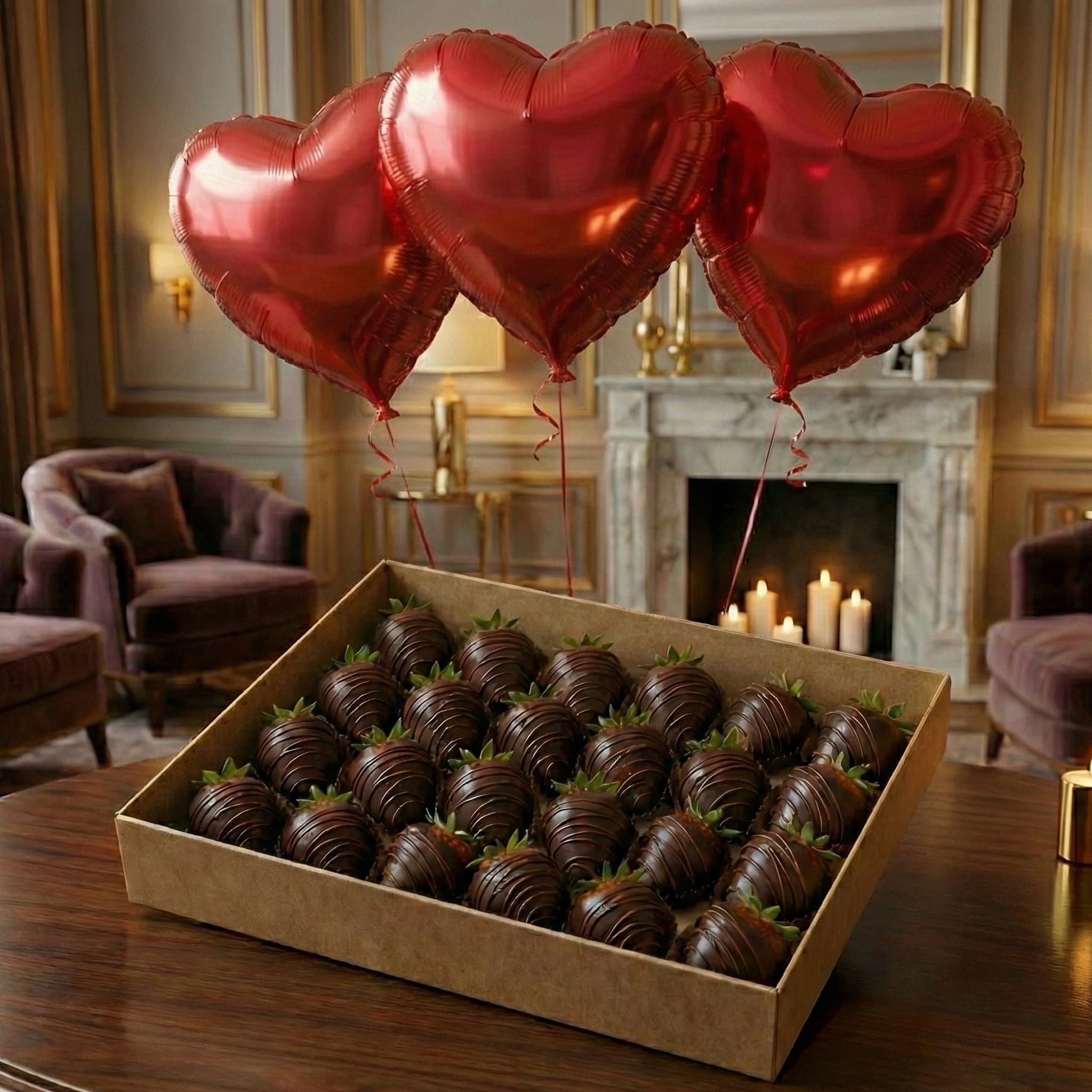 Классическая клубника в черном шоколаде + шарики красные сердечки 3 шт
