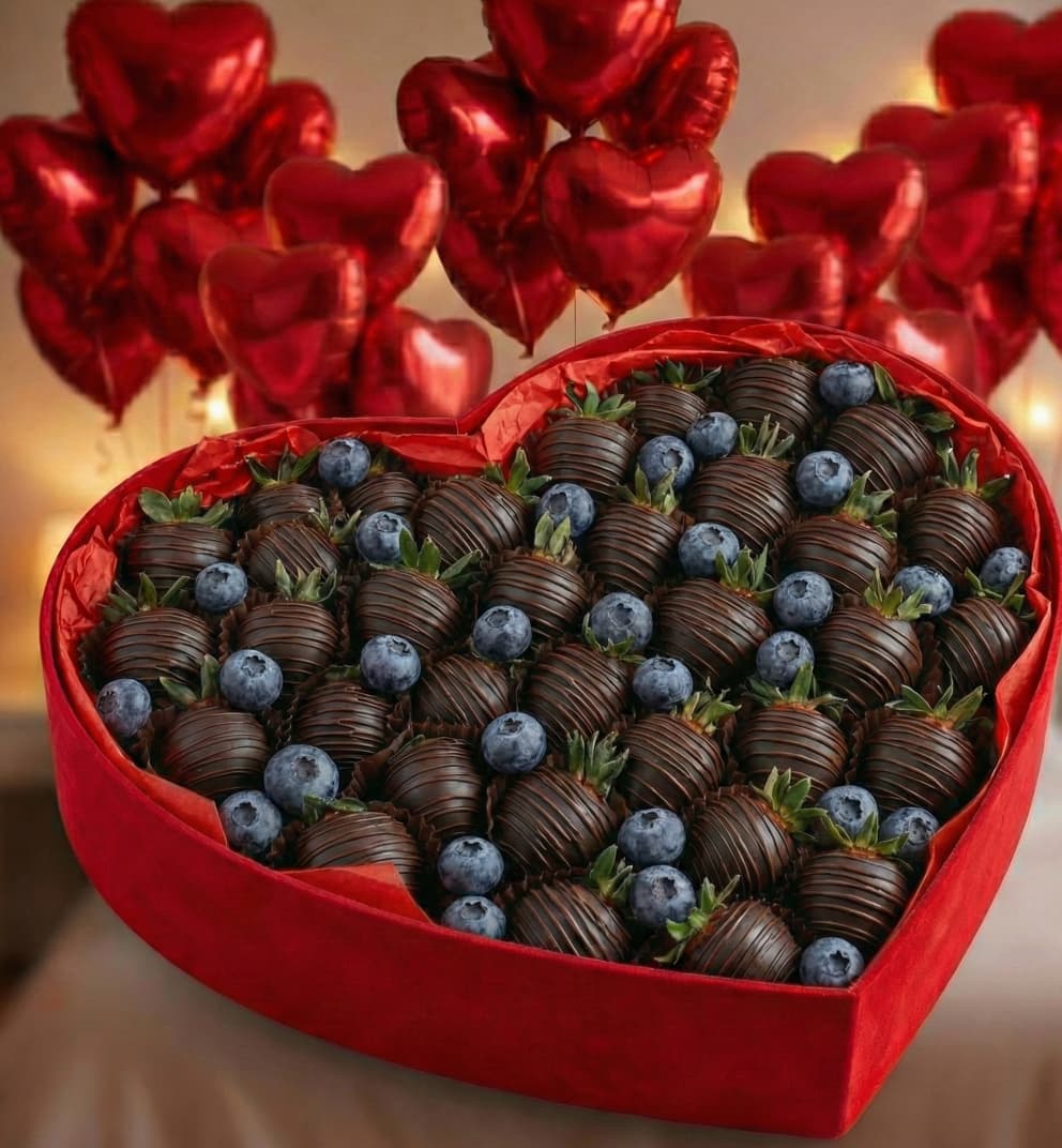 Клубника в черном шоколаде с ягодами голубики + шарики сердца 25 шт