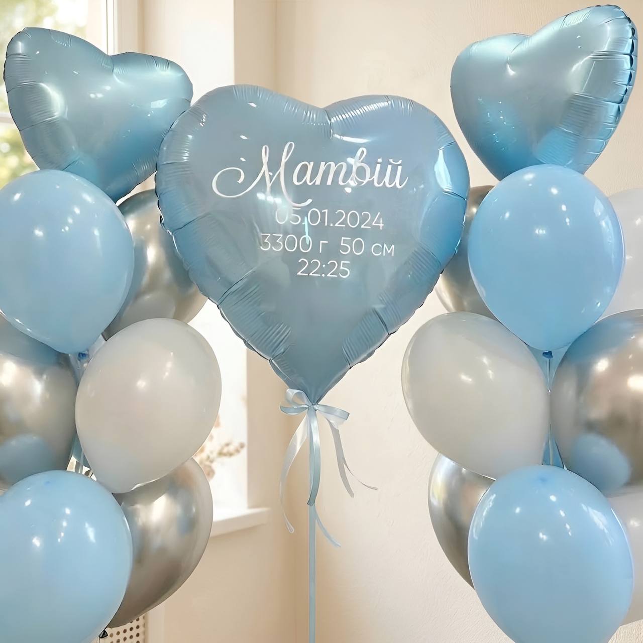 Большое сердце с именем, весом, ростом и датой рождения сыночка. А также, 2 связки шаров в голубых тонах для поздравления с выпиской малыша и мамы из роддома.
