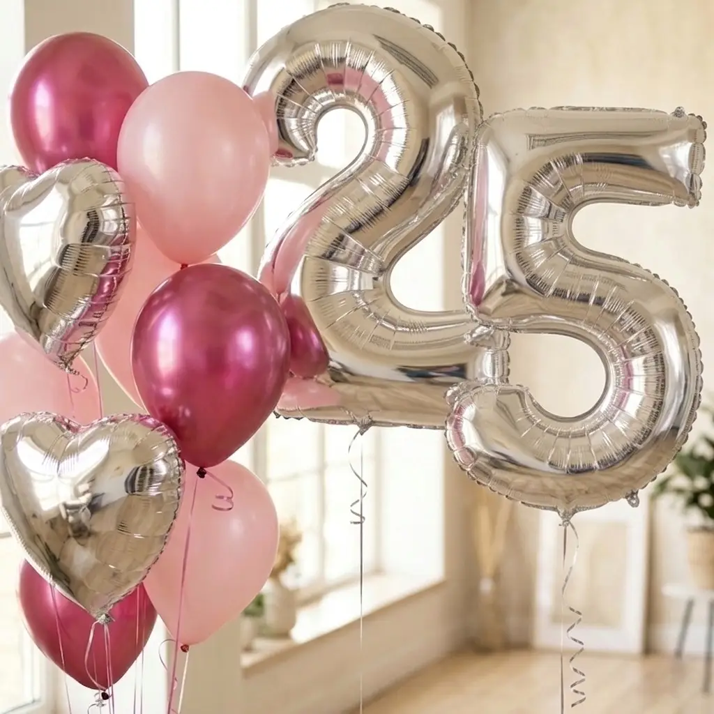 2 большие серебряные цифры (выбери нужный возраст – все цифры налицо), 4 серебряных сердца, 8 розовые матовые шарики, 6 ягодные хром шарики. - Премиум набор: