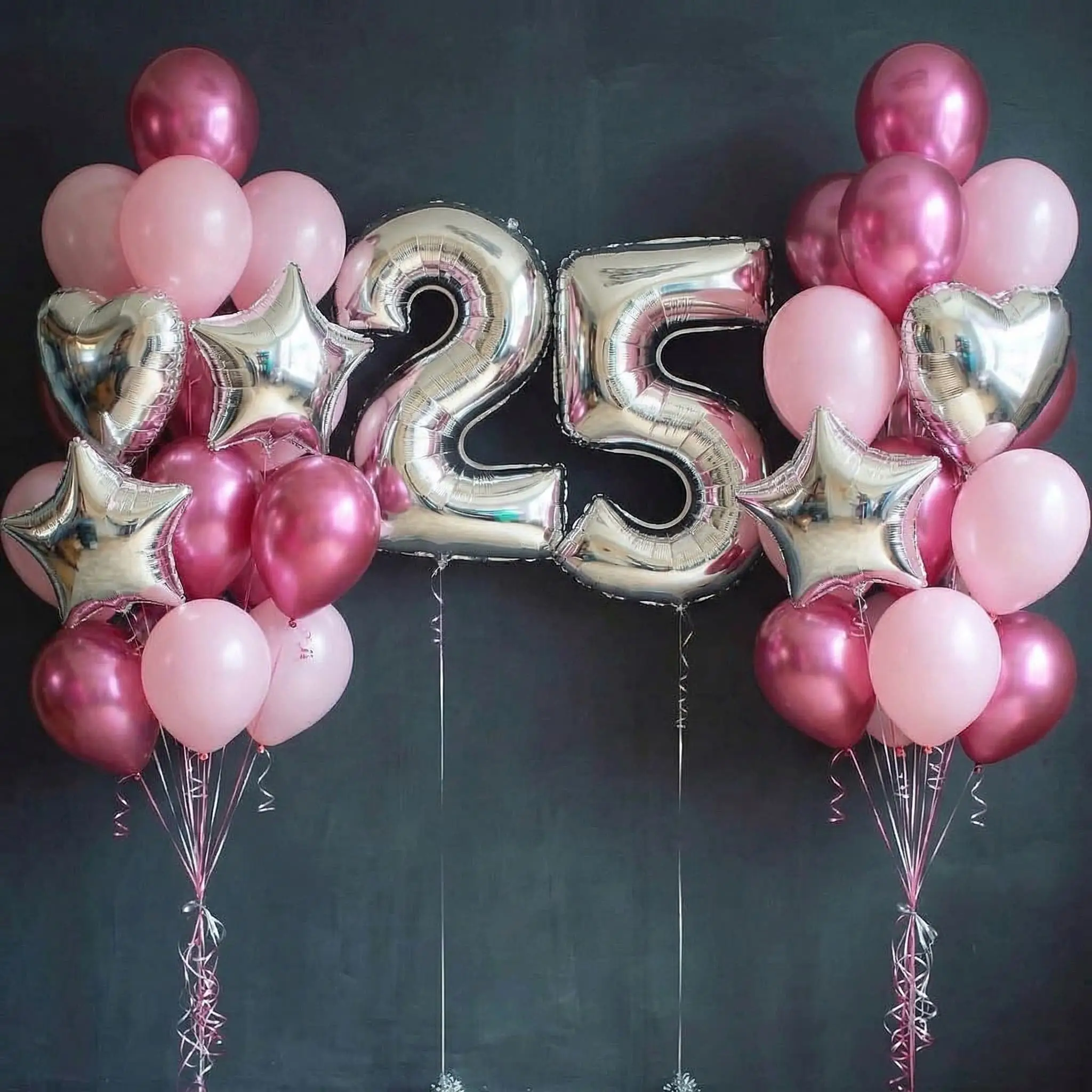 2 большие серебряные цифры (выбери нужный возраст - все цифры налицо), 2 серебряных сердца, 4 звезды, 18 розовых матовых шаров, 10 ягодных хром шариков.