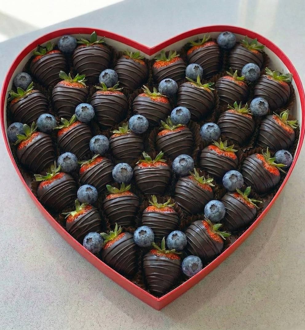 Клубника в черном шоколаде с ягодами голубики в коробке сердце