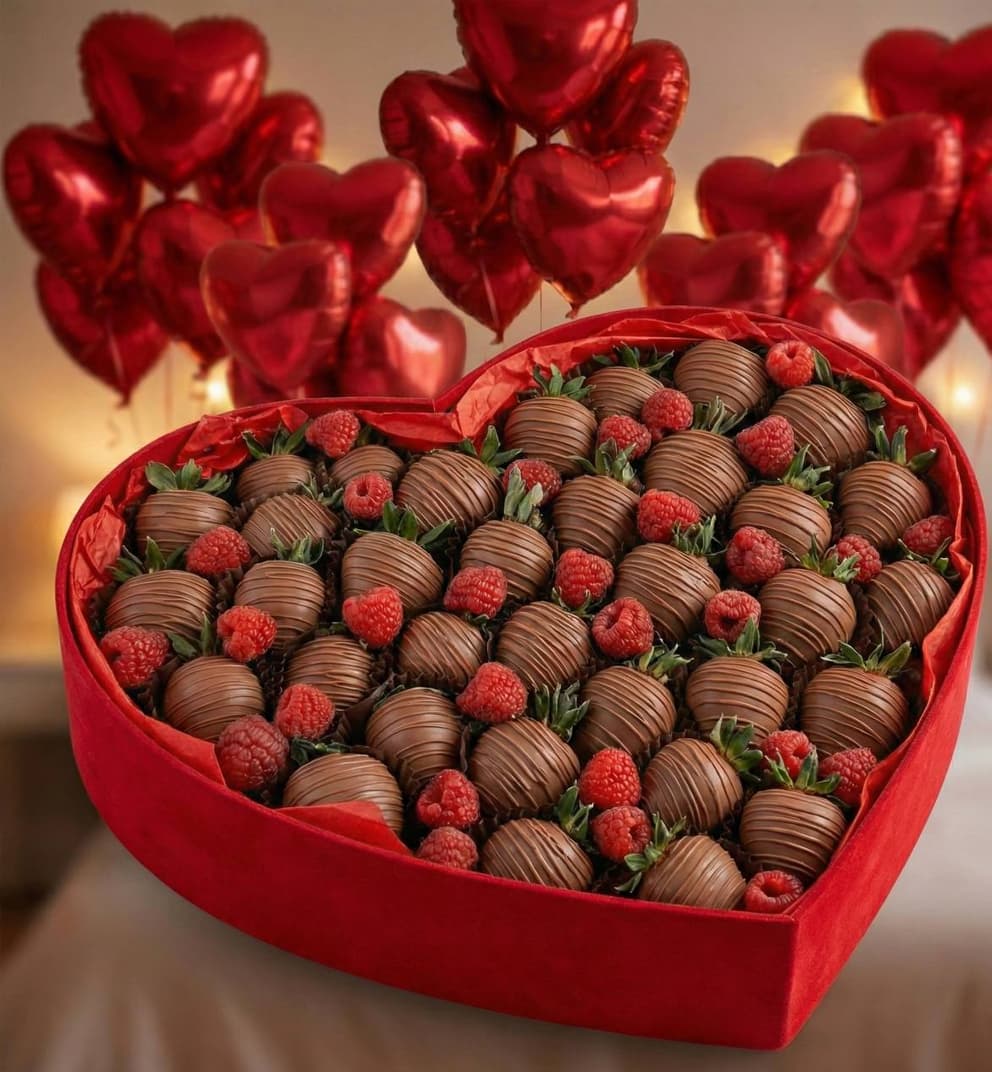 Клубника в молочном шоколаде с малиной в коробке премиум + шарики сердца 25 шт