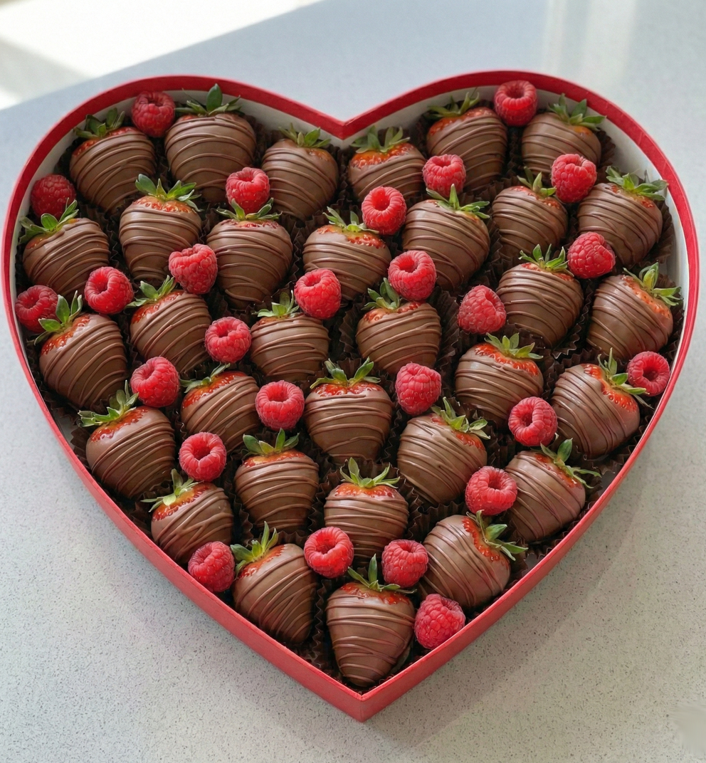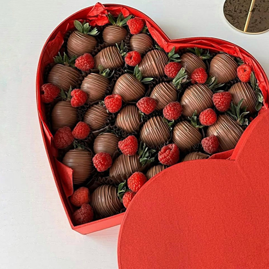 Соковита полуниця у ніжному молочному шоколаді, доповнена свіжою великою малиною. Вишуканий десерт у червоній коробці-серці — ідеальний спосіб сказати «Кохаю» без слів.