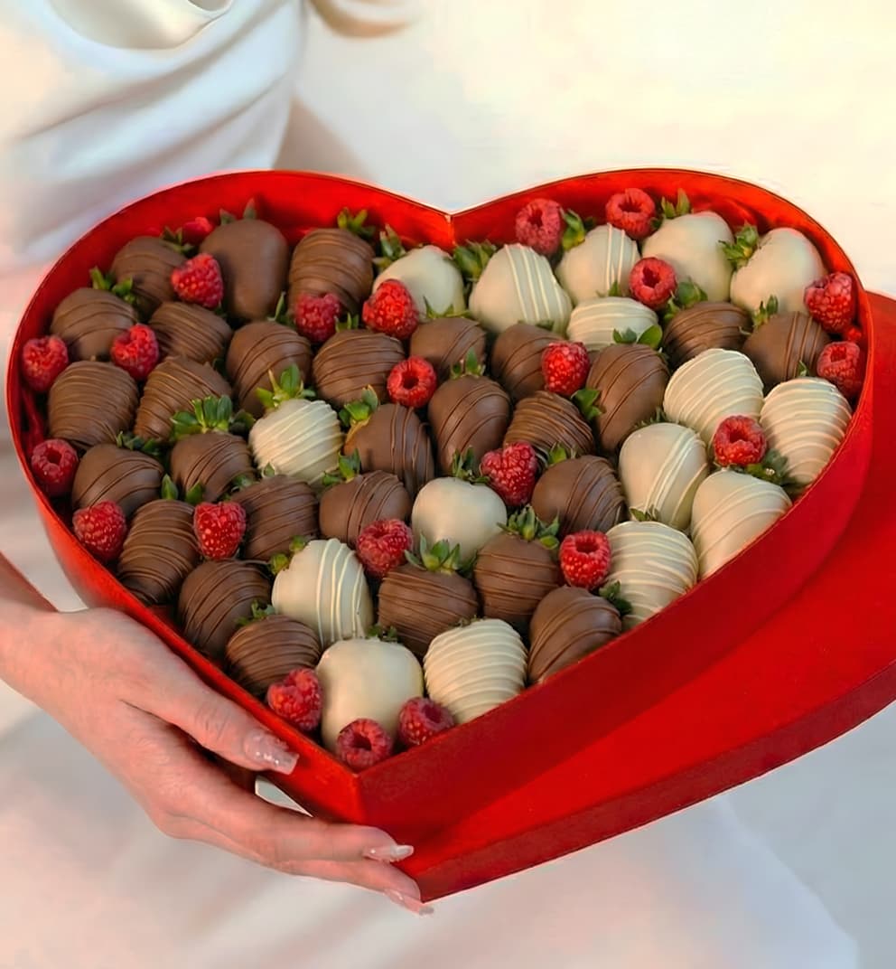Клубника в молочном и белом шоколаде с малиной в премиум коробке сердце