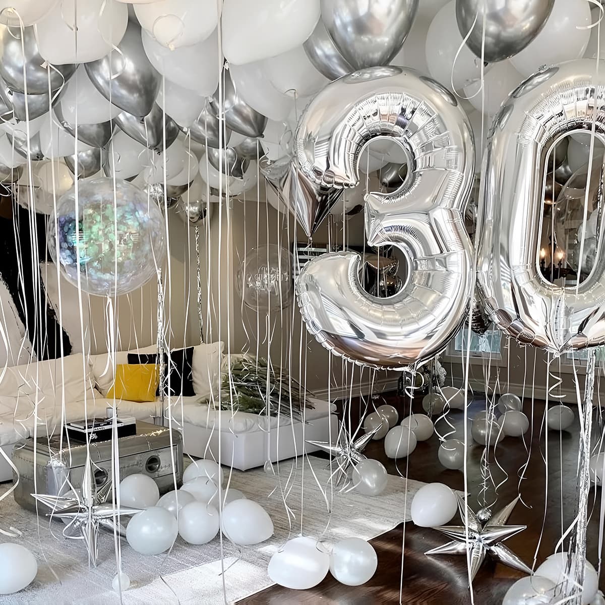 Шарики под потолком, на полу, цифры и прозрачные публичные шары создают объем, легкость и атмосферу, которую хочется фотографировать.