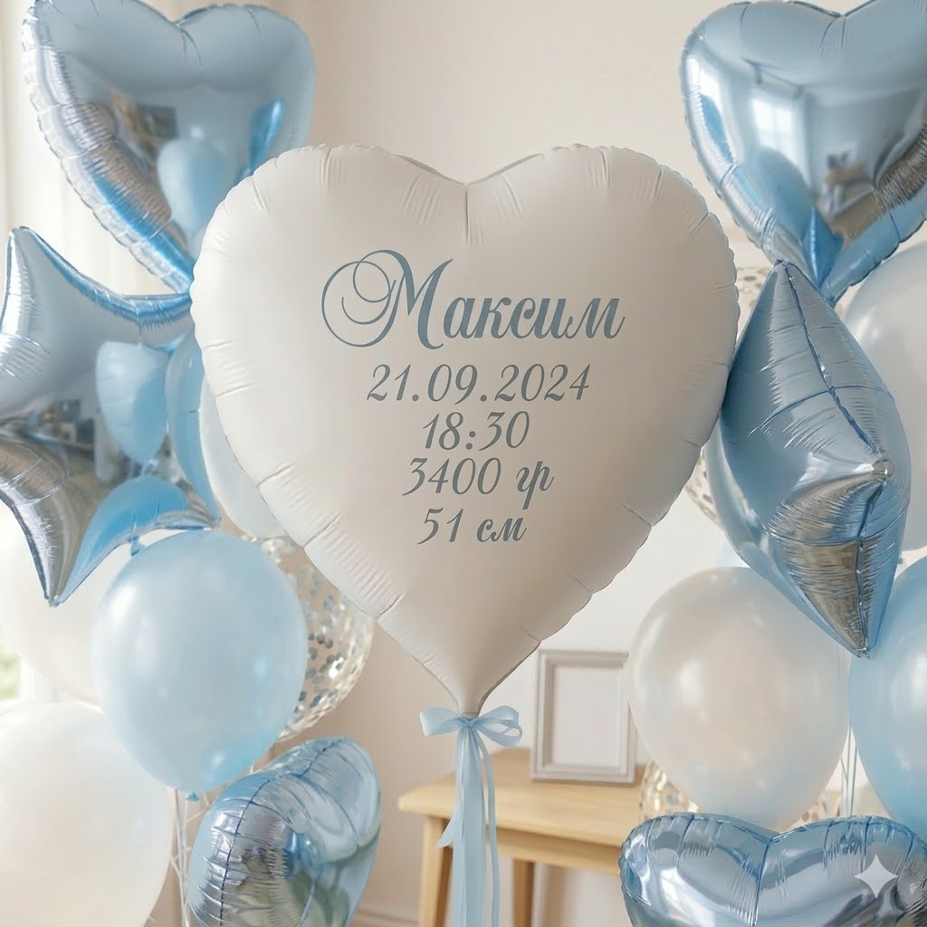 Кульки в пологовий будинок з індивідуальною написом ім'ям новонародженного: зріст, вага, дата і час народження. Набір в блакитних відтінках для привітання мами і малюка.