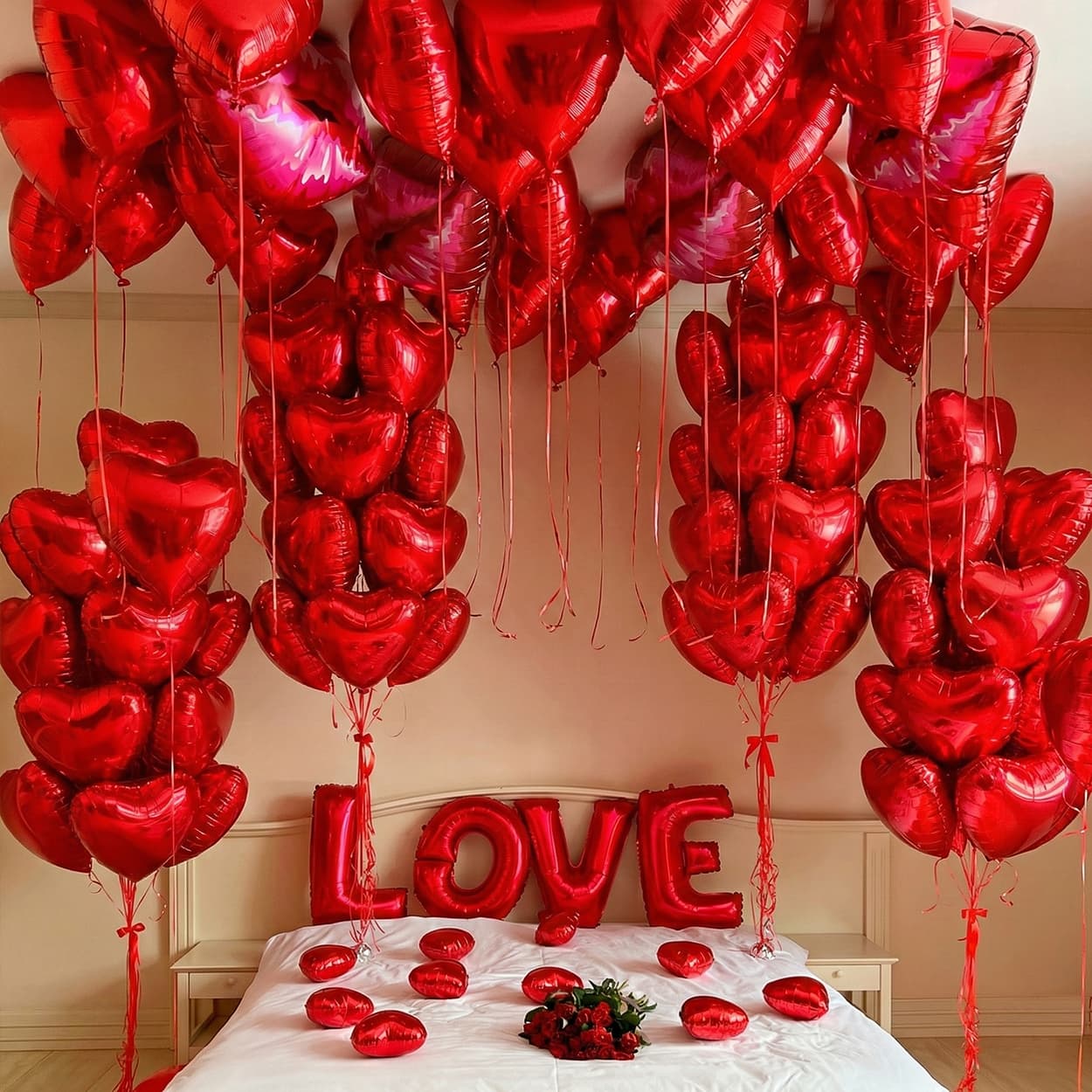 Романтическое оформление комнаты воздушными шарами.