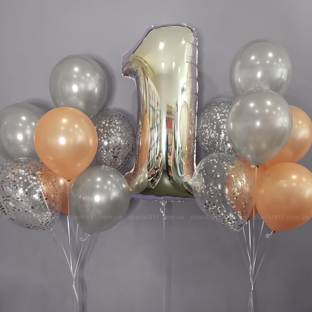 Связка шаров в оттенке розовое золото и серебро с большой цифрой в центре композиции.