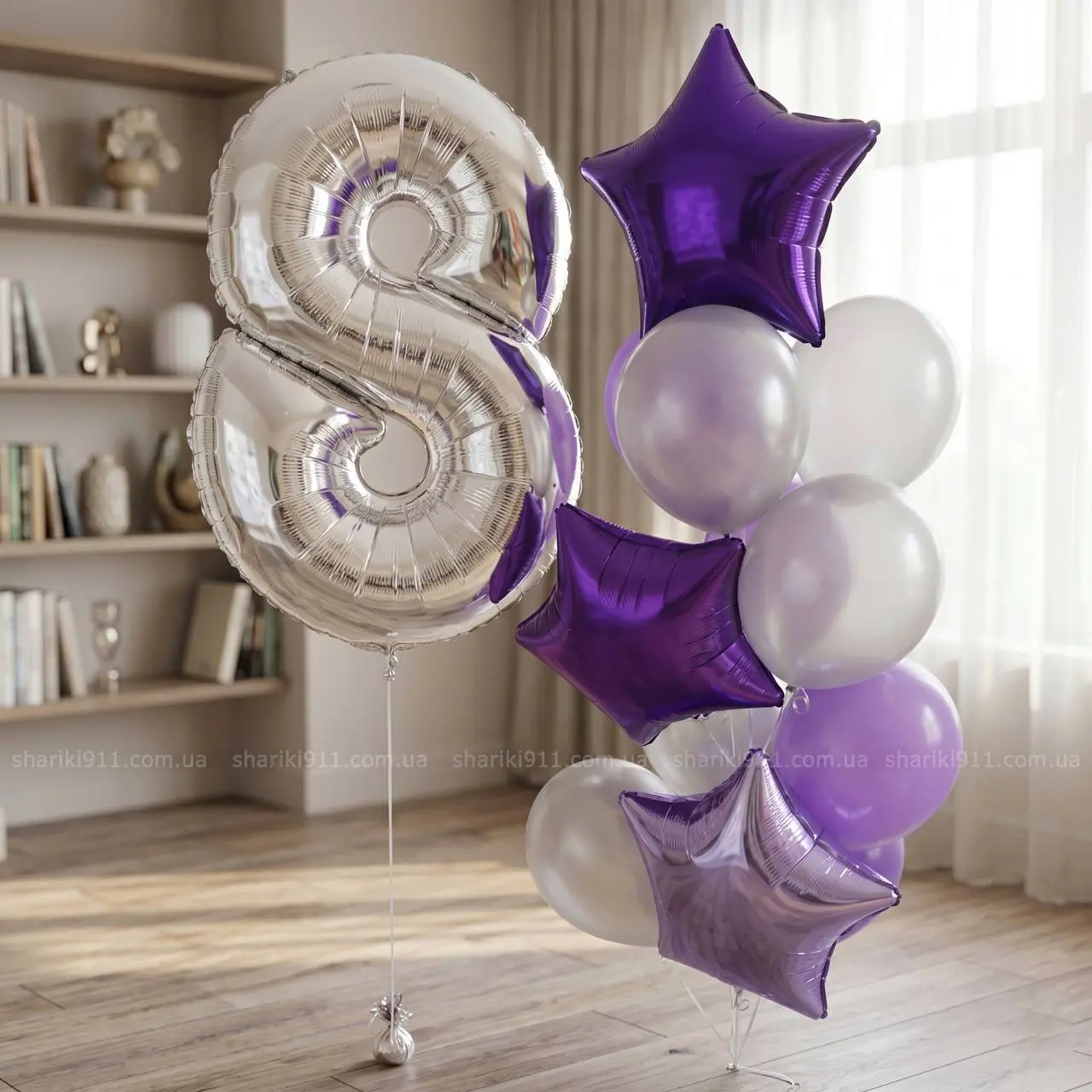 Фиолетовые, лавандовые и белые перламутровые шарики девочке на день рождения с большим шаром цифрой.