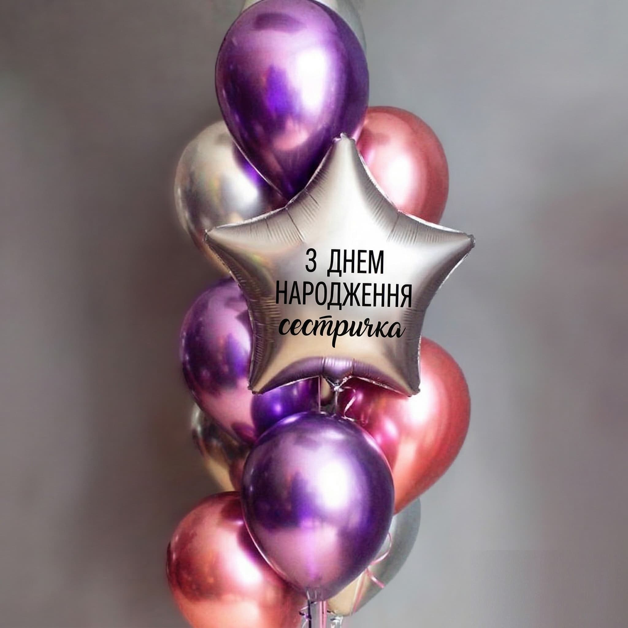 Яркие хромированные шарики на день рождения девушке и звездочка с индвидуальным текстом для персонализации подарка.